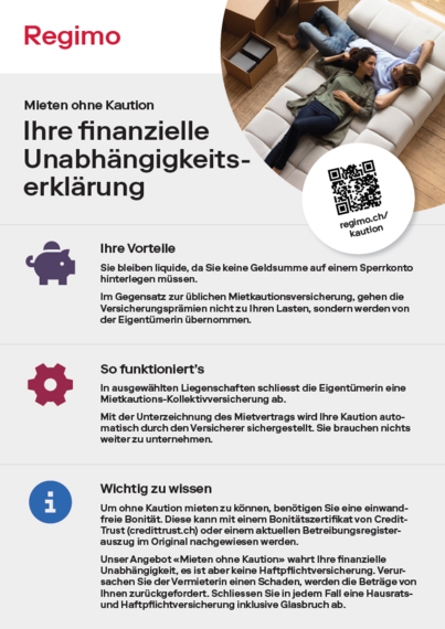 Bei diesem Mietobjekt müssen Sie nicht wie üblich drei Monatsmieten als Kaution auf ein Sperrkonto einzahlen. So bleiben Sie liquid, da nicht eine grössere Geldsumme für die Dauer Ihres Mietverhältnisses blockiert ist. Und das Beste: Das Angebot "Mieten ohne Kaution" ist für Sie gratis. Erfahren Sie mehr auf https://regimo.ch/kaution oder auf dem Flyer in der Fotoserie des Inserates.